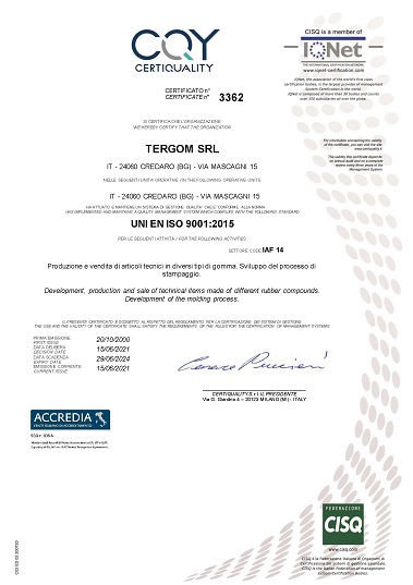 L'azienda Tergom si è certificata secondo UNI ISO 9002:1994 fin dall'ottobre 2010 ed in seguito ha ottenuto la conferma come UNI EN ISO 9001-2000 dall'istituto di Certificazione Certiquality con certificato N° 3362/01